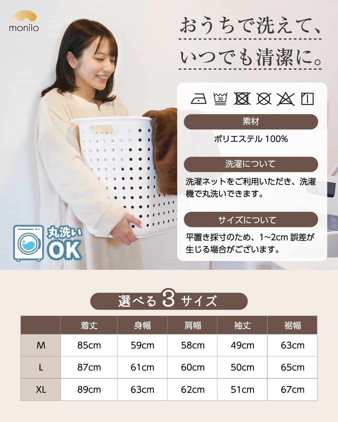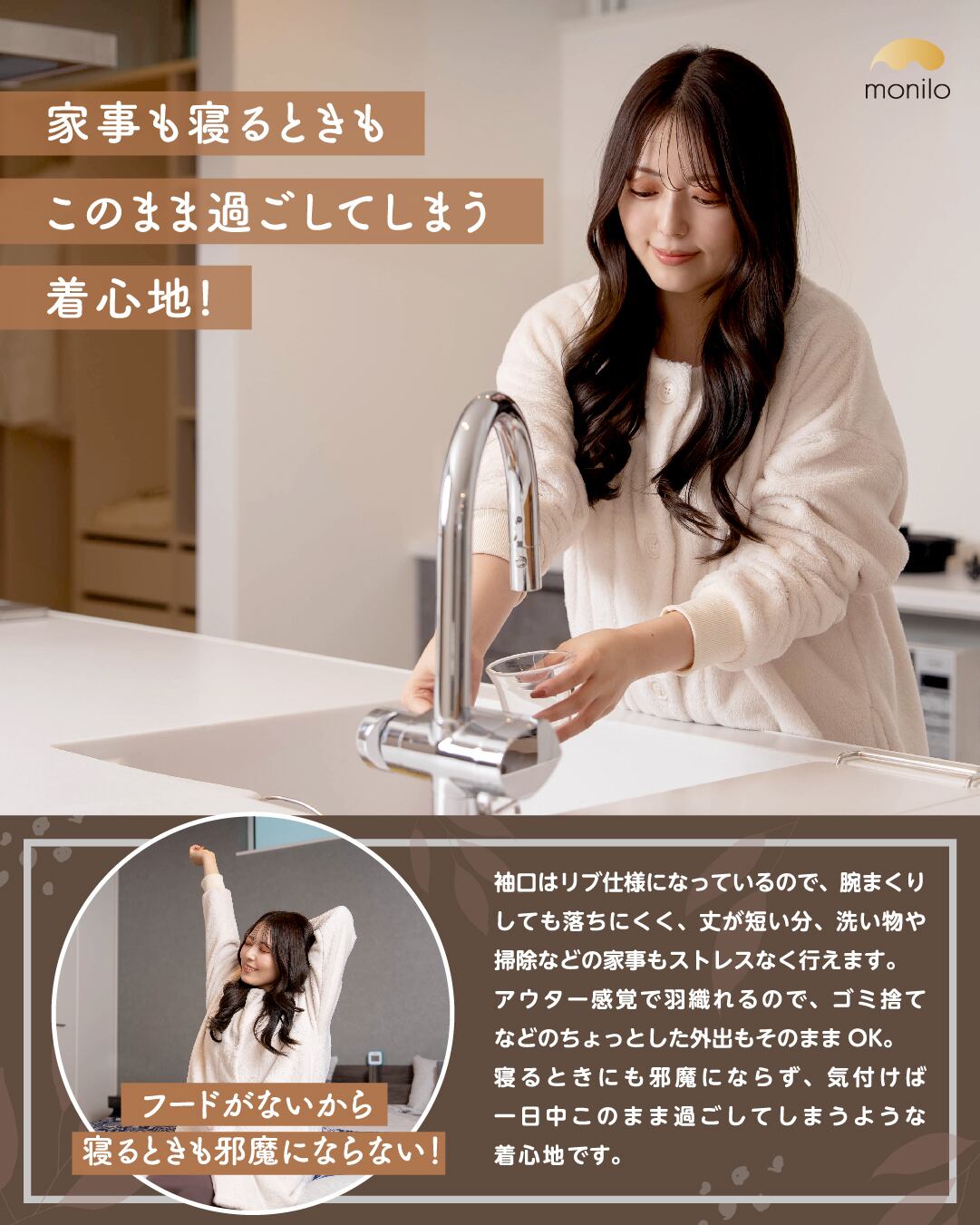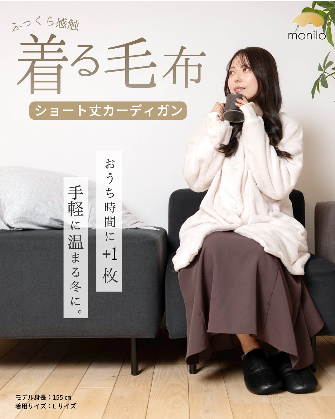 モニロの人気シリーズ、カーディガンタイプの着る毛布にショート丈タイプが登場。フードのないすっきりとしたデザインに加え、ショート丈ならではの軽さで肩も凝りにくく、ふんわり包まれるような心地よさが一日中続きます。軽くて着疲れしにくいのでお子さまにも使いやすく、就寝時の寝具としても快適にお使いいただけます。