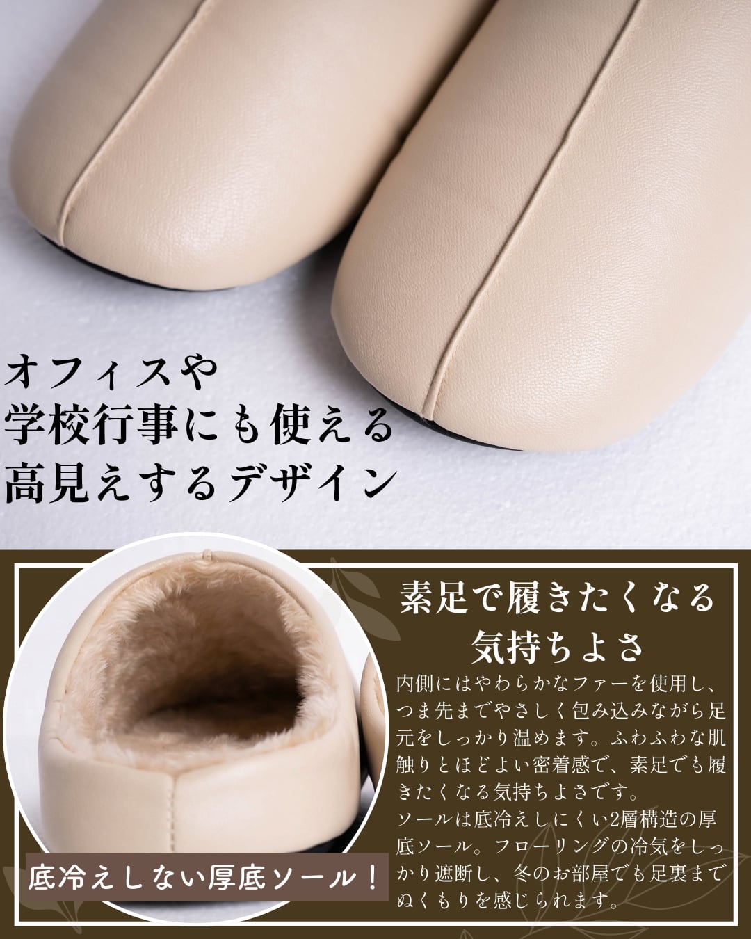 内側はもこもこであたたかく、外側はすっきりとした高見えするデザイン。おうちだけでなく、オフィスや学校行事などフォーマルなシーンでも活躍します。